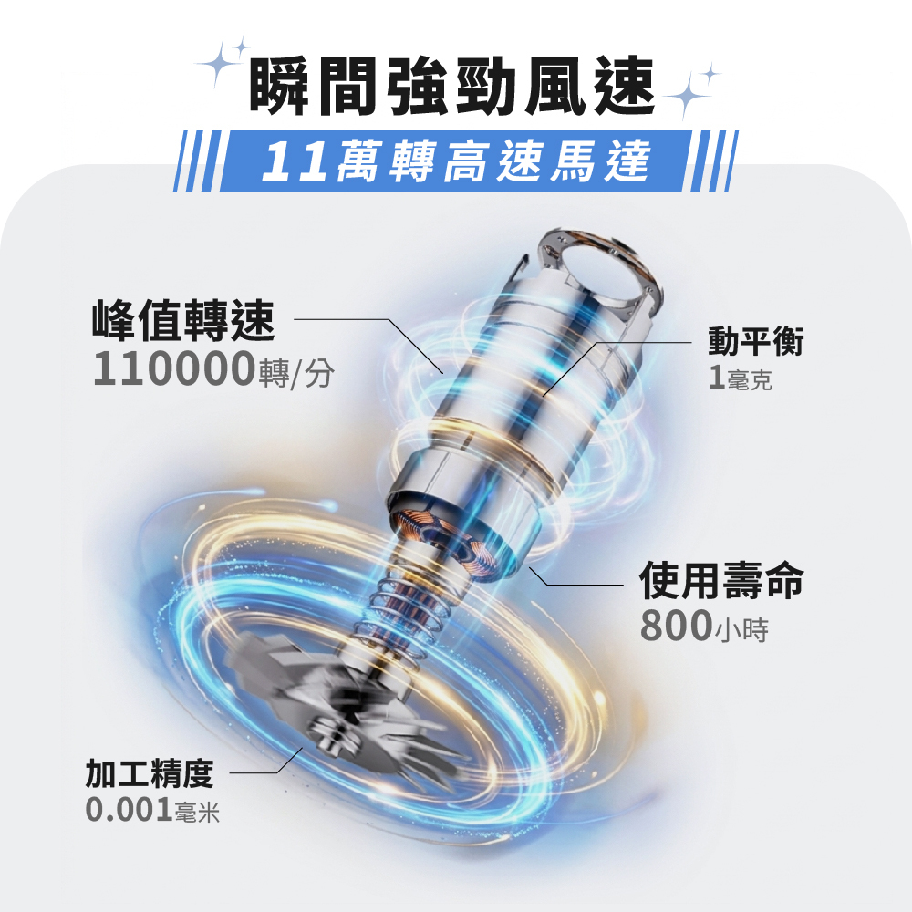 - 極致速乾: 搭載 110000 轉/分 專業馬達,提供 24m/s 颶風,長髮約 5min 內速乾,有效節省 50% 乾髮時間。
