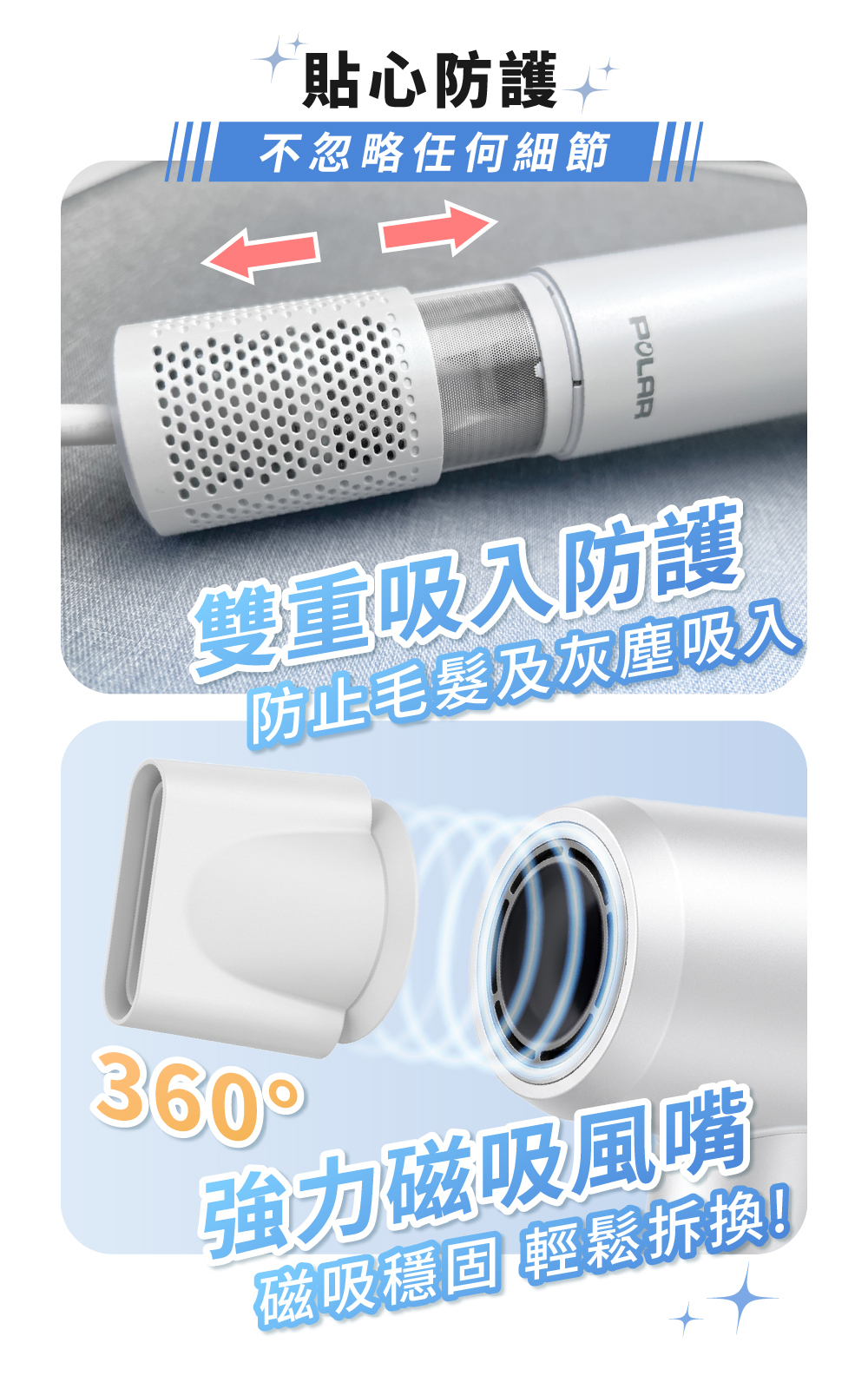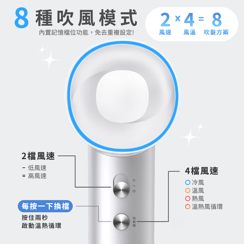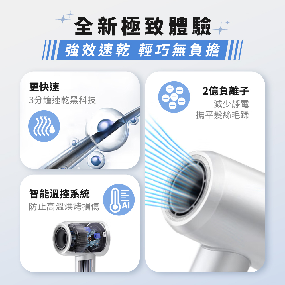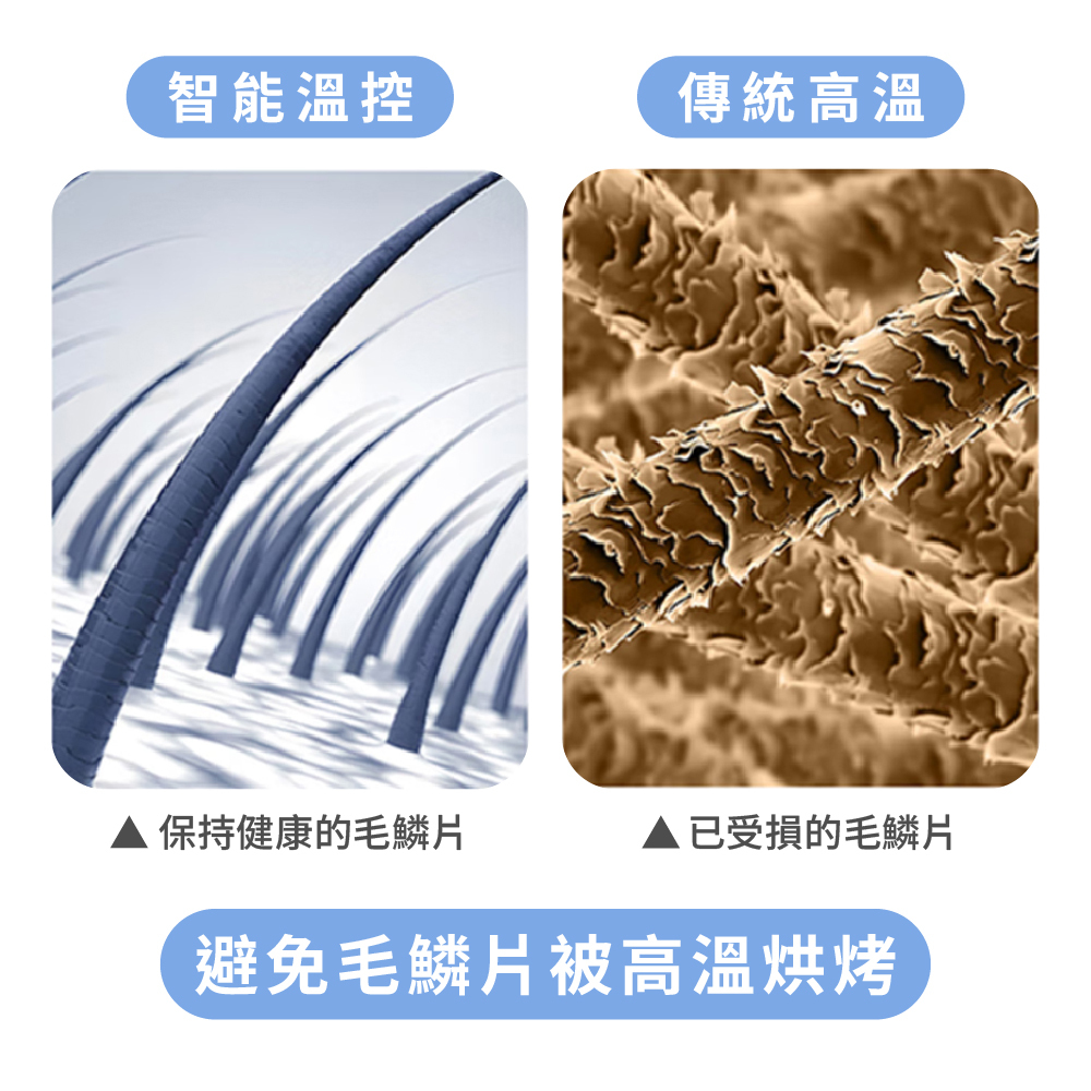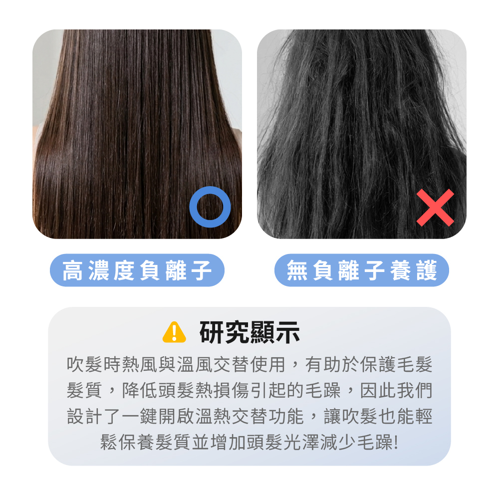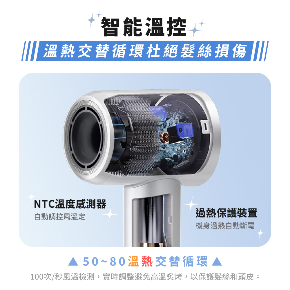 - 智能護髮: 運用 NTC 智能溫控技術,確保恆溫吹乾不傷髮。特別配備 溫熱交替循環(50°C-80°C),有效降低熱損傷。