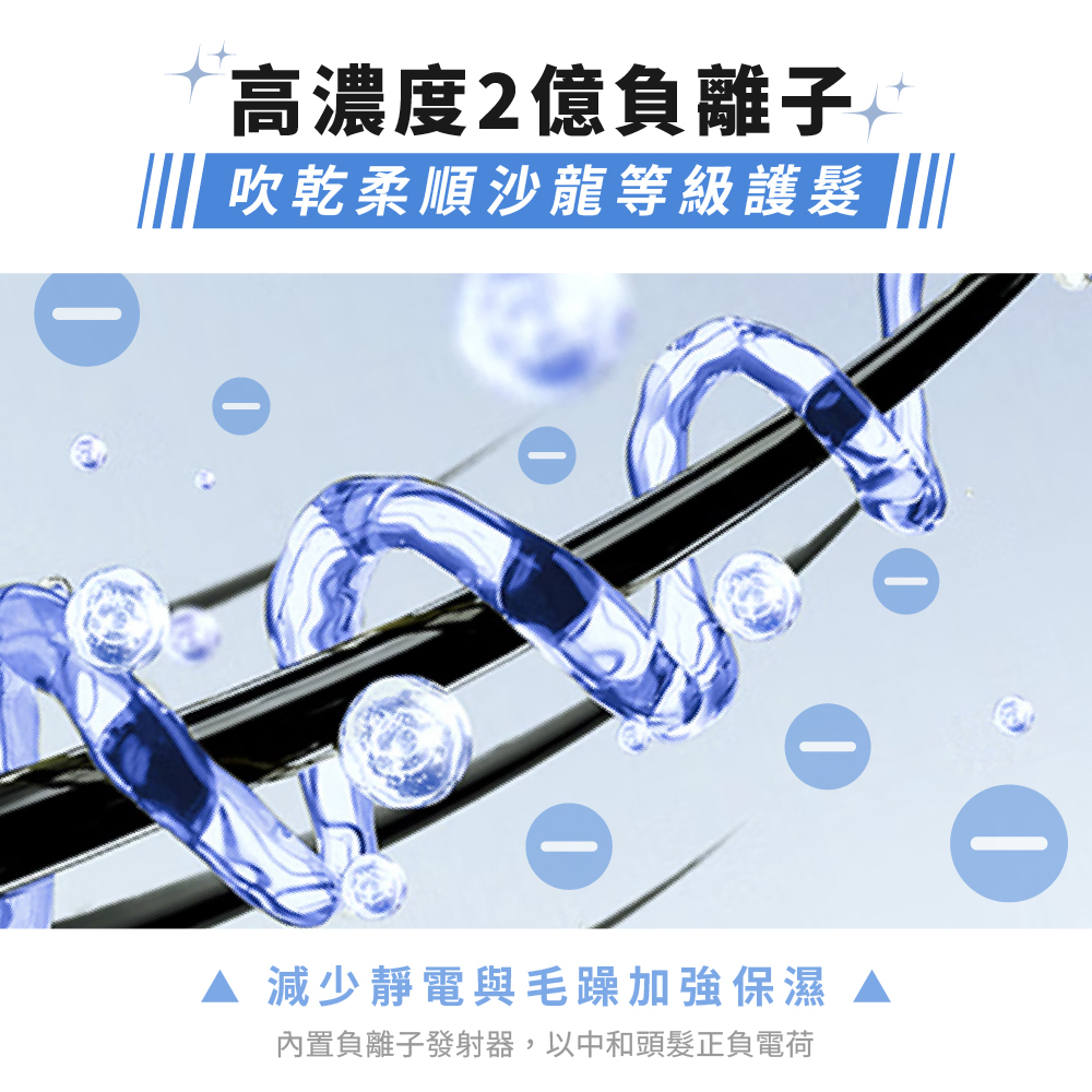 - 2 億負離子: 釋放 2 億高濃度負離子,深層滋養,強力消除靜電與毛躁,讓秀髮柔順有光澤。